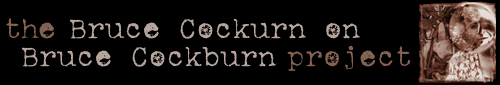 A deep debt of gratitude to Frank Brusca, for donating the content from his grandaddy of Cockburn sites, Frank Brusca's Bruce Cockburn Pages. Work is ongoing to absorb all of Frank's material into the Cockburn Project site, before Frank finally closes his Web doors. Credits will be added to the sections and pages which derive from Frank's site as this process continues.